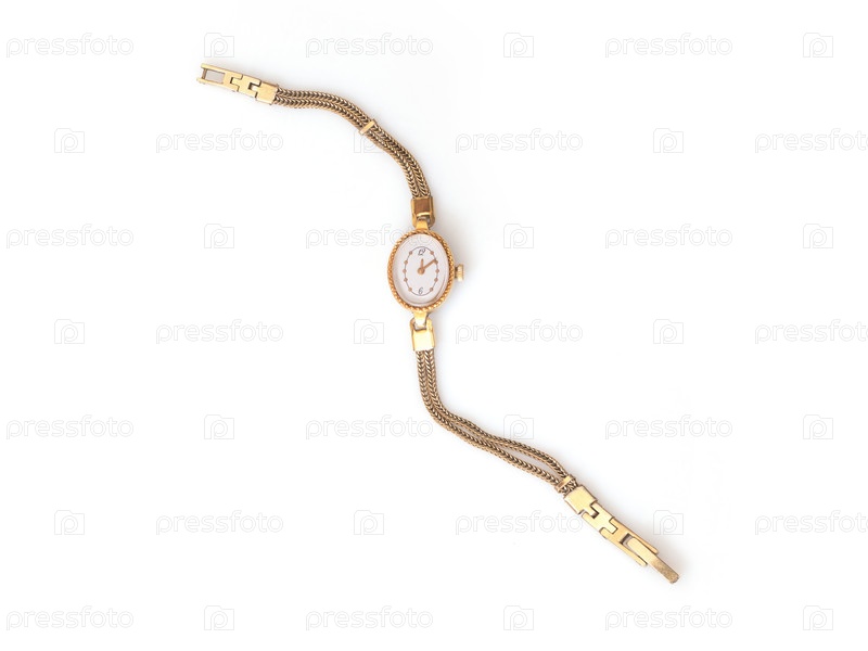 Винтажные золотые женские часы с овальным циферблатом и цепным браслетом изолированы на белом, резка готова. очень высокое разрешение