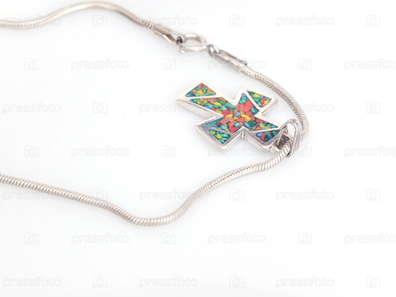 Православный серебряный крест на цепочке, изолированной на белом фоне