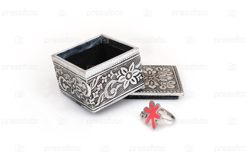 Серебряное кольцо и коробка изолированы на белом фоне