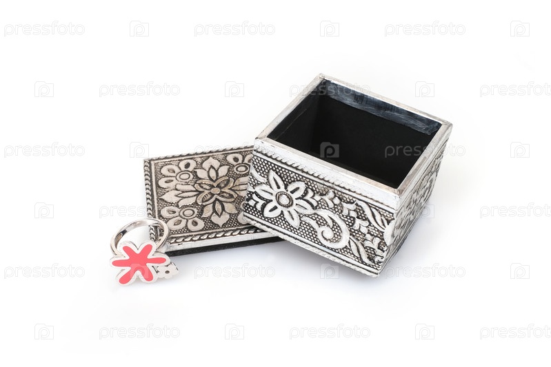 Серебряное кольцо и коробка изолированы на белом фоне
