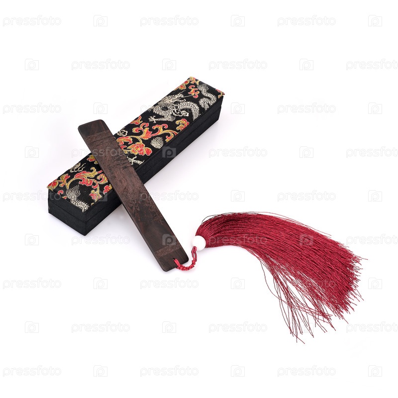 Классический китайский деревянный закладка с шелковой щеткой и шёлковым чехлом с вышивкой, изолированная на белом фоне