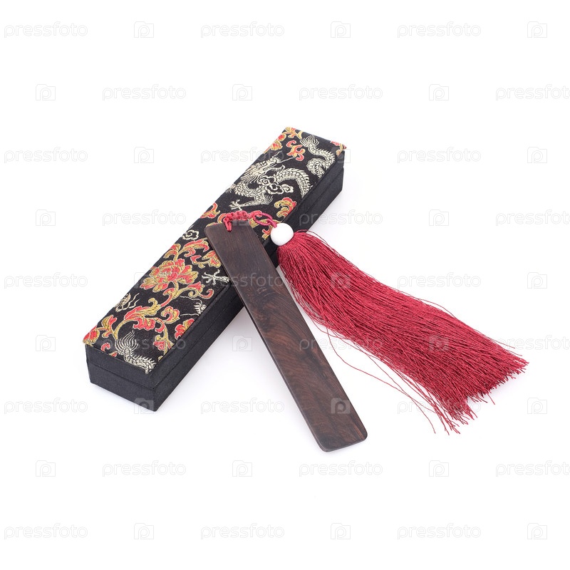 Классический китайский деревянный закладка с шелковой щеткой и шёлковым чехлом с вышивкой, изолированная на белом фоне