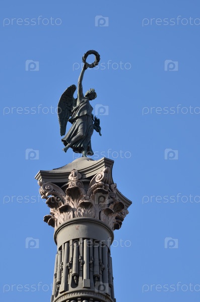 Колонна славы в честь подвигов российских войск во время русско-турецкой войны возле Троицеизмаиловского собора - православного храма в Санкт-Петербурге в солнечный летний день на голубом небе