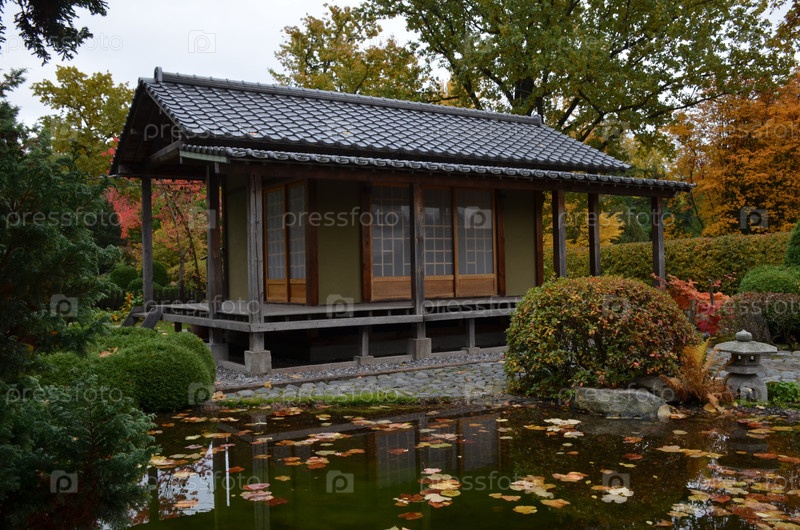 Чайный павильон в японском саду Петра Великого Ботанический сад в Санкт-Петербурге осенним днем