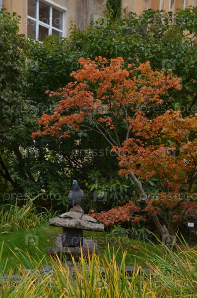 Голубой голубь сидит на японском садовом фонарике Торо среди яркой осенней листья Ботанического сада Петра Великого в Санкт-Петербурге