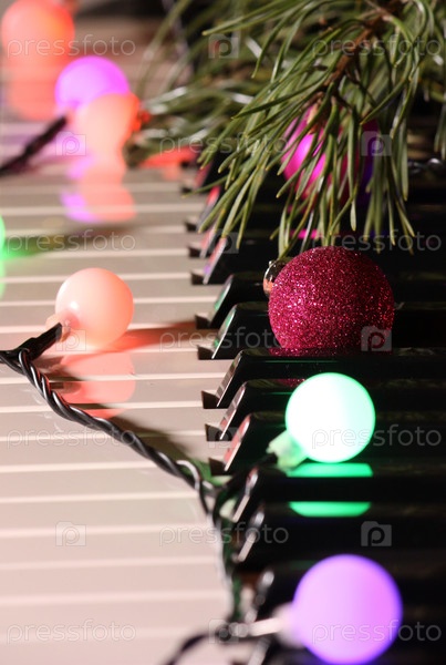 Клавиши фортепиано с гирляндой и сосновой ветвью