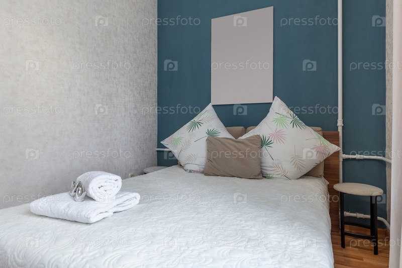 Удобная кровать с белым постельным бельем, мягкими подушками и синим акцентом на стене, создавая чистую, спокойную и привлекательную атмосферу спальни