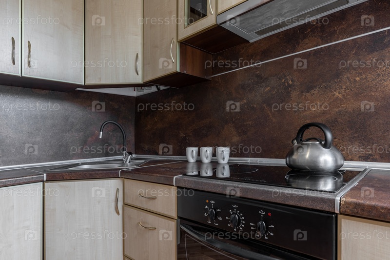Компактная современная кухня с электрической плитой, металлическим чайником, коричневой столешницей и легкими деревянными шкафами создает практичный домашний интерьер