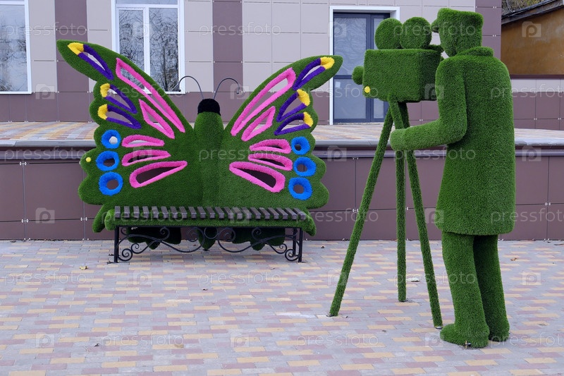 Фигура оператора, снимающего бабочку Композиция на городской площади Россия Ertil 24 октября 2025