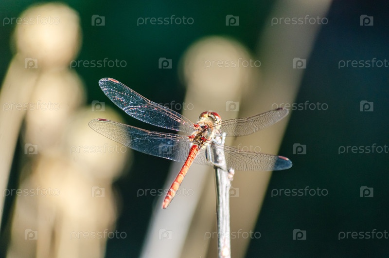 Ярко-красная волынка с прозрачными крыльями на фоне природы