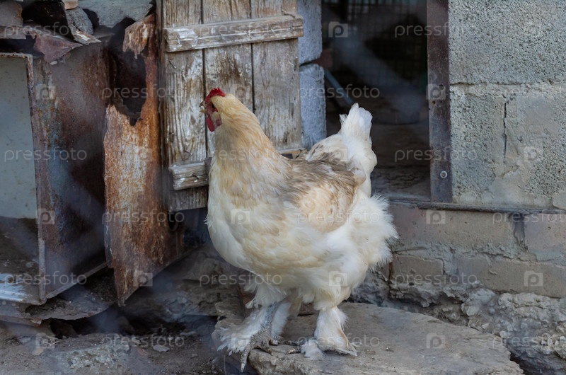 Пушистая белая курица Брахма у входа в темный цыпленок