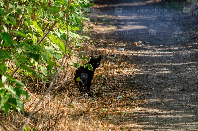 Черная кошка заглядывает из кустарников на лесной тропе в солнечном свете