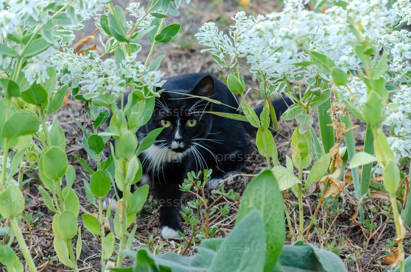 Черная кошка с белыми пятнами выглядит из белых цветов