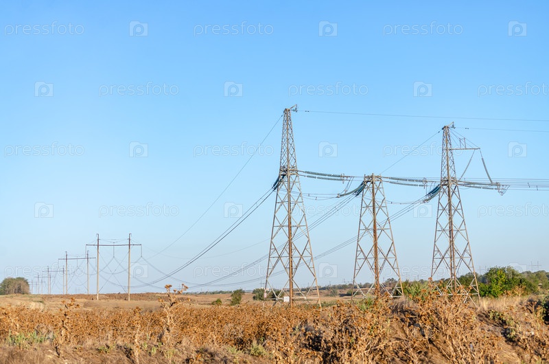 Электрические линии против чистого голубого неба в поле
