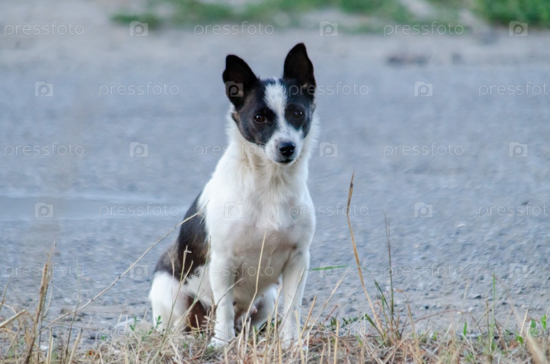 Одинокая чёрно-белая собака на обочине дороги