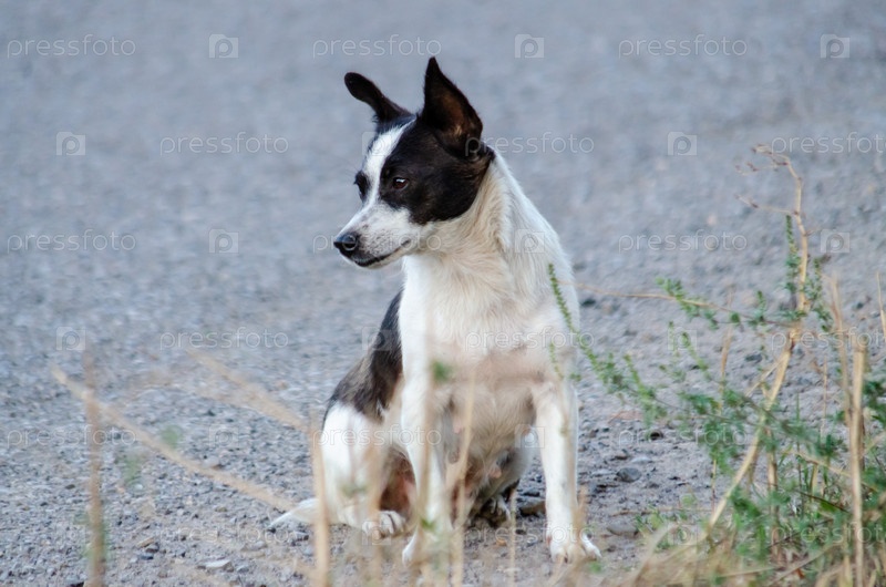 Одинокая чёрно-белая собака на обочине дороги