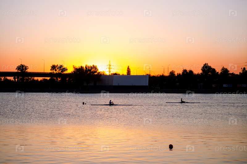 Силуэты гребцов на озере посреди заката с городским пейзажем в отдалении
