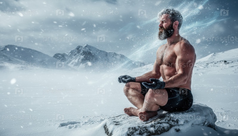 Мужчина, медитирующий без рубашки в заснеженных горах, воплощает силу холодной выносливости и осознанности, которая способствует связи человека с экстремальной природой