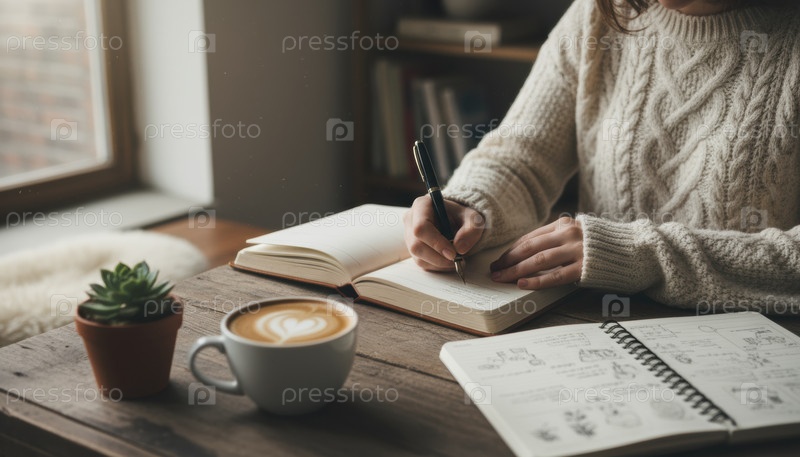 Человек пишет записки с кофе на деревянном столе, символизируя творчество, журналистику и внимательность в повседневной жизни или рабочей среде во время уютного осеннего утра