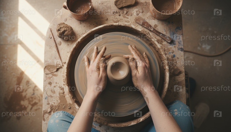 Близкий план рук, образующих глину на колесе горшечника, представляющий творчество, осознанность и возвращение искусства руки в сегодняшней культуре медленного жизни