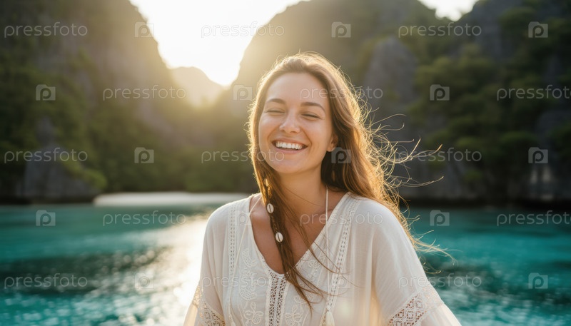 Улыбающаяся женщина стоит перед бирюзовой водой и известняковыми скалами, символизирующими радость отдыха и тропических путешествий, предлагая темы, подходящие для продвижения праздника или образа жизни
