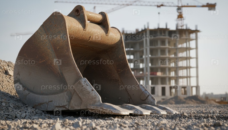Строительное ведро опирается на гравий рядом с незавершенным зданием, чтобы представить рост городского развития