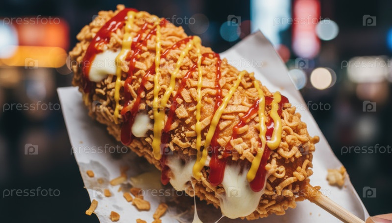 Хрустящие уличные куриные доги, покрытые соусом, демонстрируют глобальные тенденции в еде, культуру удобных закусок и яркую атмосферу ночного рынка в городских условиях
