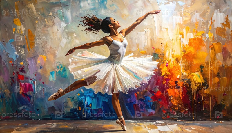 Грациозная балерина танцует на абстрактном красочном фоне, символизирующем художественную страсть, творчество и свободу человеческого выражения через движение