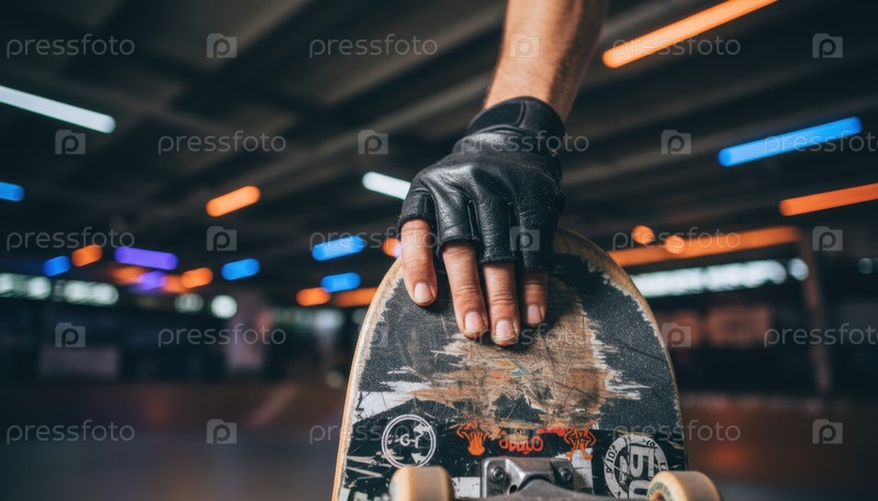 Лесбиянка держит изношенную доску в городском парке, символизирующую молодежную культуру, энергию уличных видов спорта, личный стиль и сырой дух современного экшн