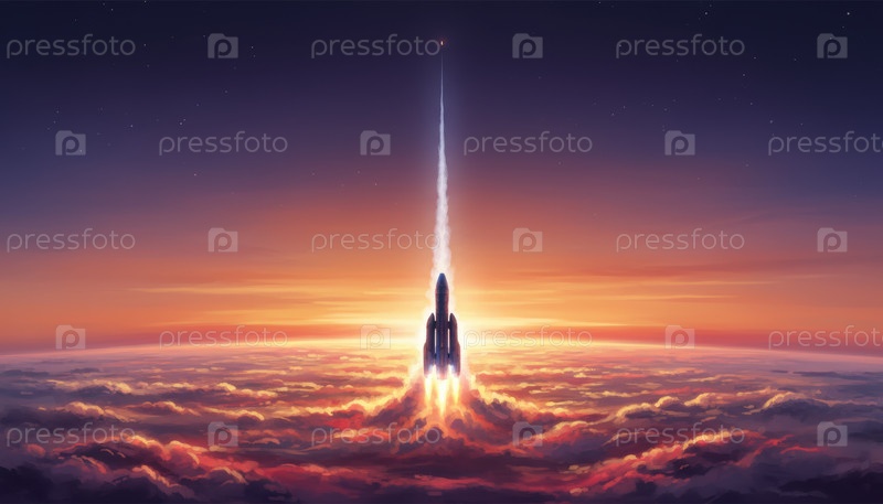 Ракета, поднимающаяся через светящиеся облака на рассвете, символизирует амбициозное исследование прогресса и постоянное стремление человека к инновациям в науке и космических путешествиях