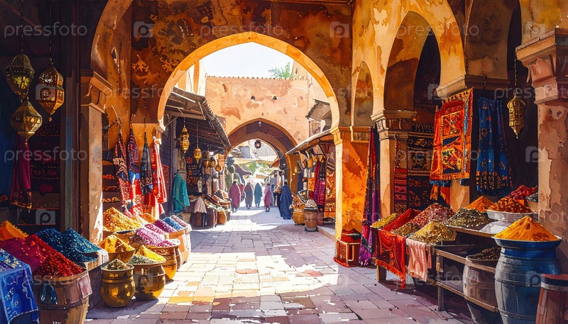 Живой рынок с красочными специями и тканями под арками, символизирующими культуру Ближнего Востока, традиции и туристическое вдохновение