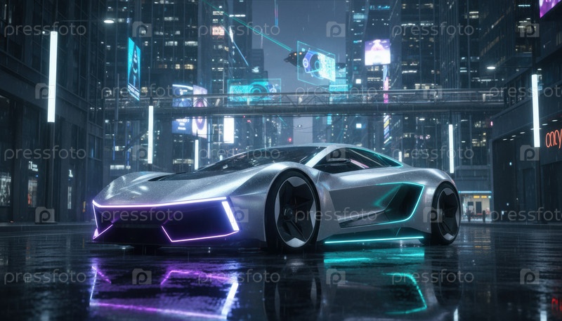 Неоновый спортивный автомобиль в дождливом городском ландшафте отражает скорость, будущую мобильность и энергию ночной жизни и может представлять собой технологический тренд, городской стиль или инновационную концепцию