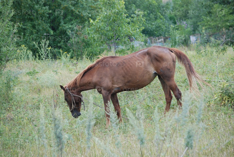 Взрослая лошадь пасется на лугу