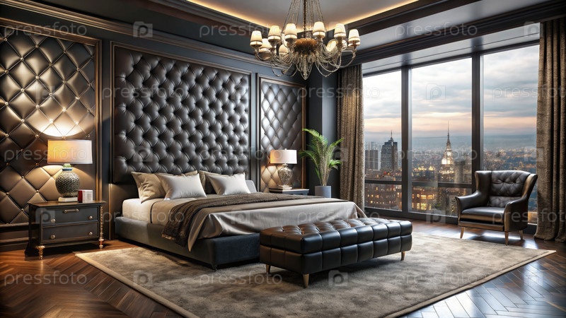 Роскошная спальня с большой кроватью и люстру