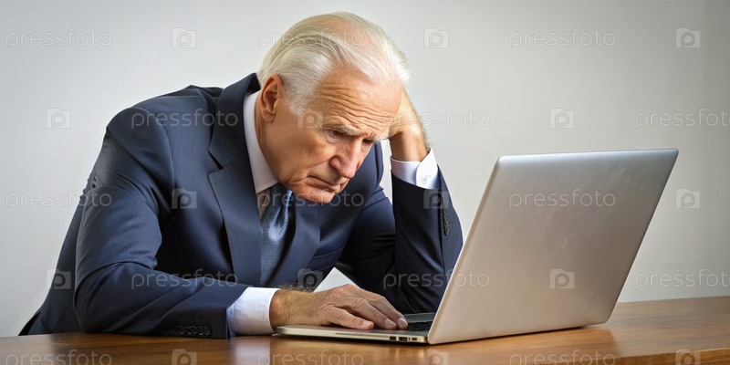 Пожилой человек нажимает на ноутбук, сосредоточившись на создании ИИ