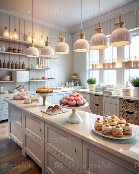 Белая кондитерская кухня с нежными тортами и висящими лампами