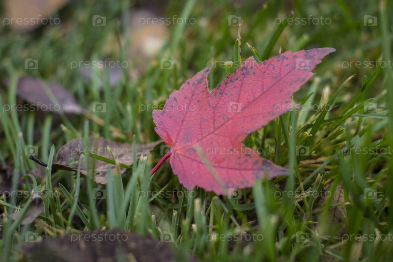красный кленовый лист среди зеленой травы