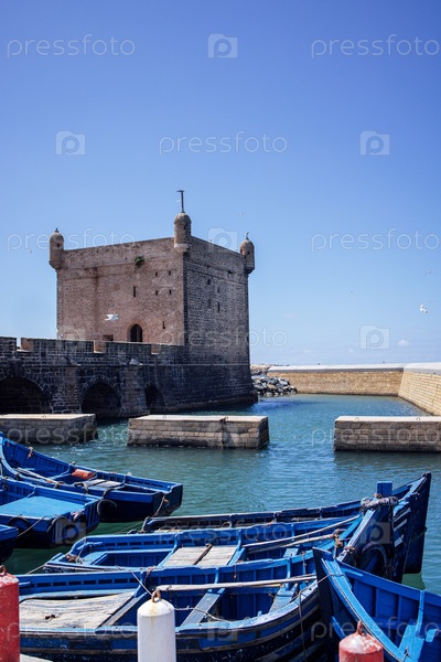 Голубые рыбацкие лодки пришвартовались в тихой гавани с исторической каменной башней, величественно стоящей на прозрачном голубом небе и создающей живописную прибрежную сцену