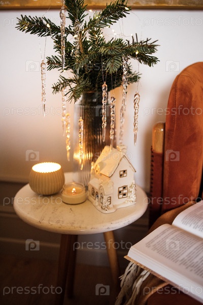 Праздничное праздничное украшение с миниатюрным домом, свечами и вечнозелеными растениями на уютном столе, создавая теплую и привлекательную атмосферу для сезонных торжеств