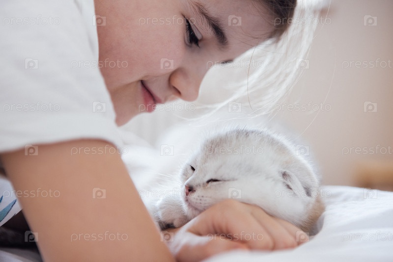 Маленькая девочка с коричневыми волосами нежно взаимодействует со спящим белым котенком на мягкой кровати, демонстрируя нежный момент привязанности и общения