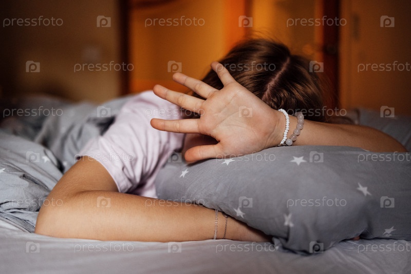 Молодая девушка с длинными волосами, лежащая в постели, закрывая лицо рукой, окруженная мягкими подушками и одеялами, передает ощущение расслабления и комфорта в уютной атмосфере