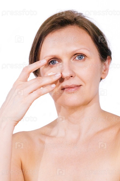 Зрелая женщина наносит крем для ухода за кожей на свое лицо, демонстрируя рутину красоты с акцентом на здоровье кожи и самообслуживание в яркой минималистической среде