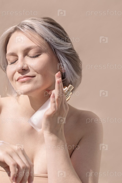 Молодая женщина с короткими серебристыми волосами наносит средства по уходу за кожей на лицо, наслаждаясь моментом самообслуживания, при этом мягкий бежевый фон повышает атмосферу спокойной красоты