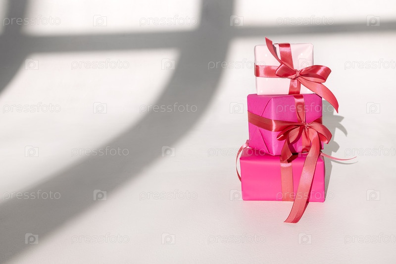 Три подарка в яркой упаковке и атласные луки на белом фоне