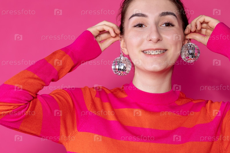 Улыбающаяся девушка в розовом полосатом свитере с Рождественскими шарами на розовом фоне