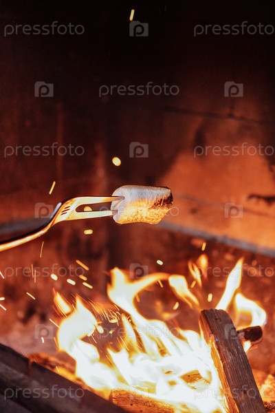 Закройте вилку с конфеткой.Маршаллоу жарят на открытом огне в камине дома.Прекрасное боке со искрами