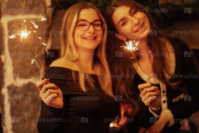 Две девочки смеются и держат в руках искру.Сладко улыбающиеся подростки празднуют Рождество