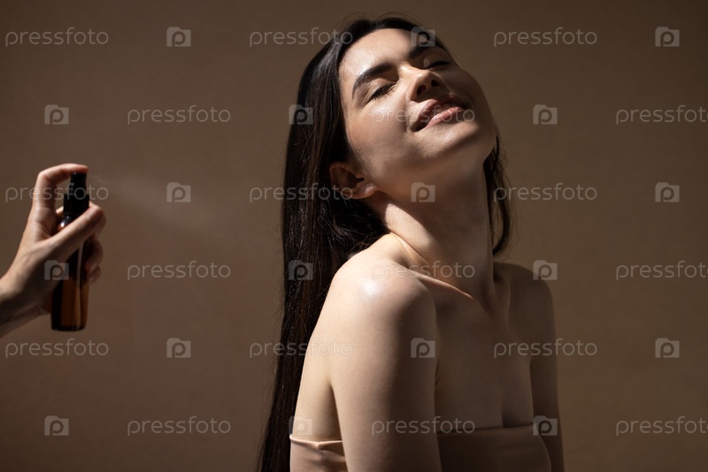 Азиатская женщина наслаждается косметической процедурой с спреем, демонстрируя сияющую кожу и спокойное выражение лица, подчеркивая самообслуживание и здоровье в минималистской обстановке