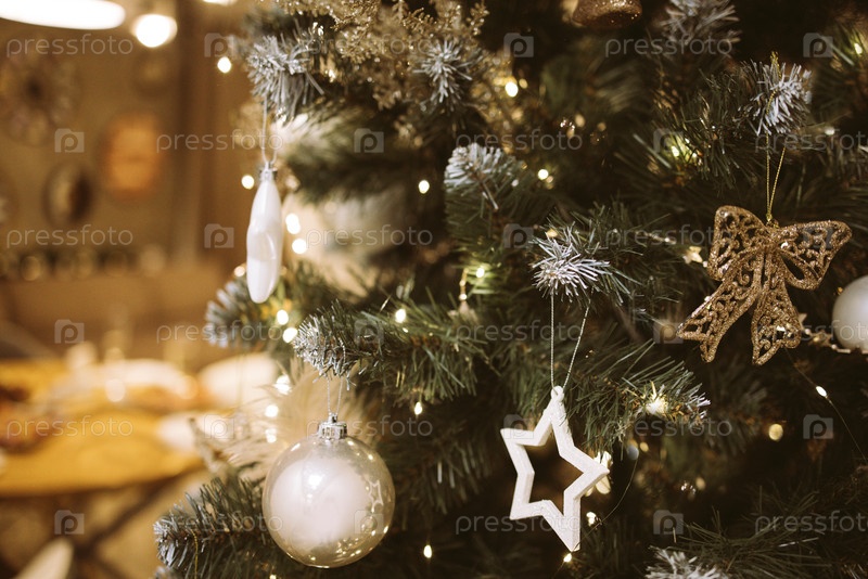 Рождественская елка, украшенная белыми драгоценностями, золотыми луками и мерцающими огнями, создает праздничную атмосферу в уютной гостиной для праздничных торжеств