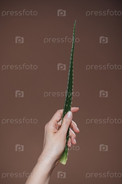 Рука держит ярко-зеленый лист алоэ вера на мягком коричневом фоне, демонстрируя естественную красоту и пользу для здоровья растения в минималистической композиции